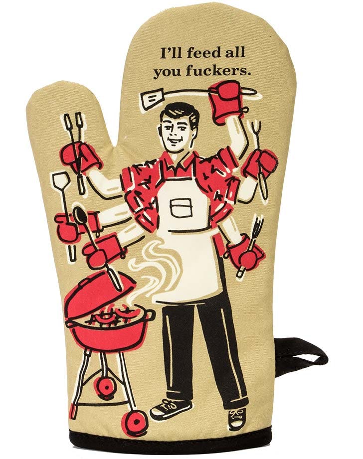 I came across an article featuring these funny oven mitts for those that like to curse or have a little fun when they’re cheffing-it-up in the kitchen: